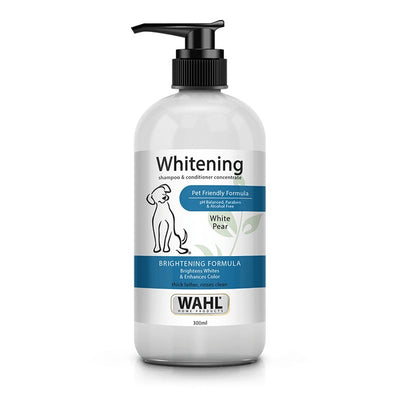 Wahl’s Whitening Shampoo contains less than 1% colour enhancer to help whites to be whiter and colours brighter. The rich lather deep cleans dirt and environmental residue that dulls your dog’s coat. The easy rinse shampoo leaves you dog’s coat clean, silky and smooth. Wahl Whitening Shampoo Contains- White Pear: Prevents skin damage, treats oily, dry and flaky skin. Moisturises skin to keep it smooth & soft. Plant based cleansers make Wahl’s Shampoo the choice for owners who want to avoid harsh chemicals for you and your dog. Also is PEG-80 Free, Alcohol Free, and Paraben Free.