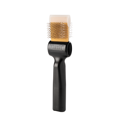 For double-coated dogs, there is nothing more arduous than removing all that dead undercoat from deep under the topcoat. Any groomer that has had to work through a large Husky or Samoyed will attest that it is truly a formidable task. The FlexIT Soft Flex Gold Undercoating brush will give you back half the time and relieve half the stress of this undercoating undertaking! When you look at the pin pattern on the Gold Soft Flex brush you will see that like the Finishing brushes, the pattern is very linear. The pins themselves, however are quite different. The FlexIT Gold Soft Flex Undercoating brush has long, thin pins with a very tiny hook on the end. This pattern is specifically designed to quickly plunge through the topcoat, and get right down to the undercoat. This helps streamline the brushing process significantly, cutting down on pressure needed to penetrate the topcoat while the small hooks engage more of the deep undercoat.